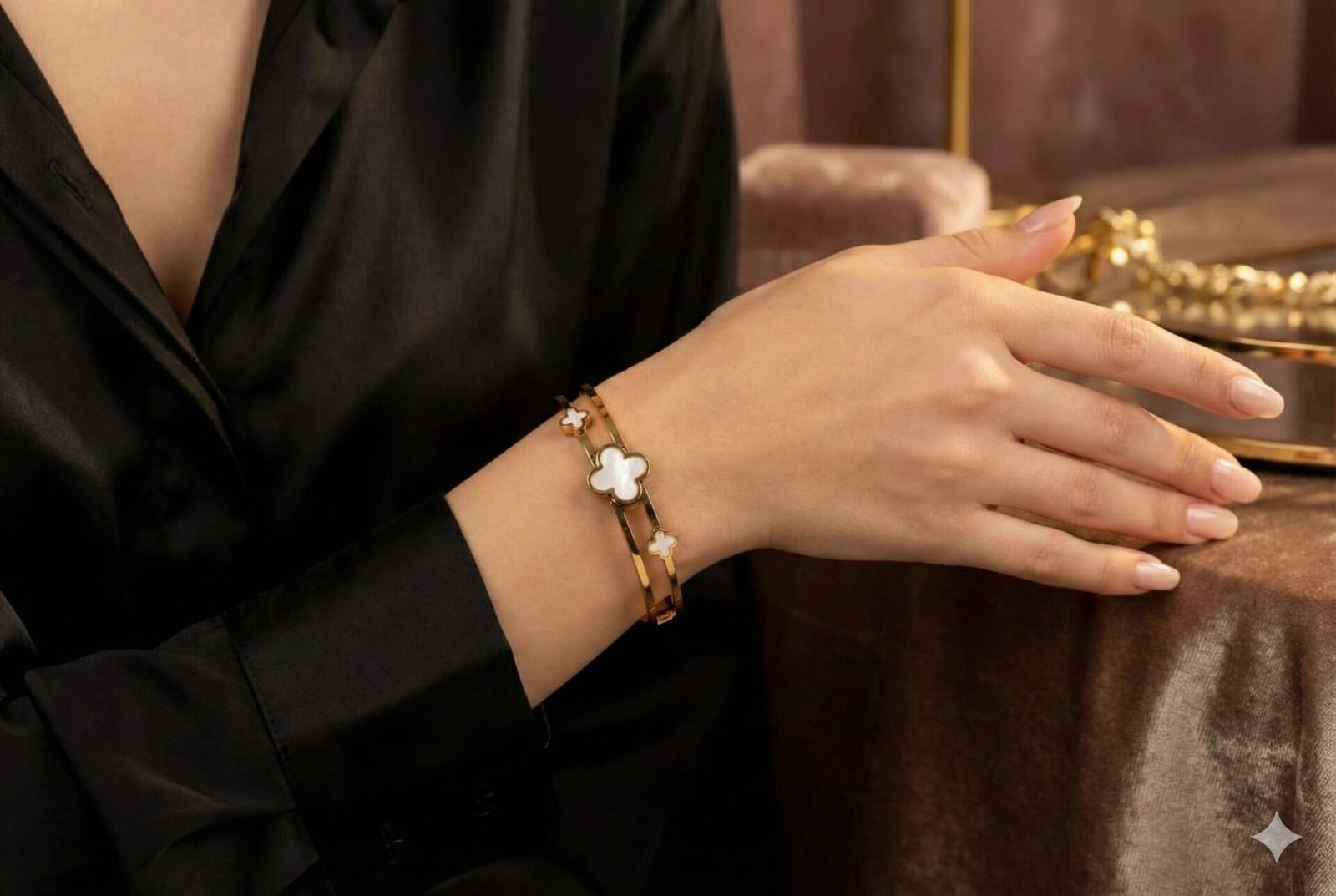 Elevate your style with this Elegant Gold Plated Clover Bracelet, designed to bring a perfect blend of sophistication and charm to every outfit. Featuring a premium mother-of-pearl clover motif surrounded by a sleek dual-band gold finish, this bracelet offers a luxurious look that suits both daily wear and special occasions.