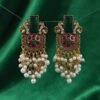Exude timeless elegance with these exquisite gold-plated ethnic earrings, featuring a stunning combination of deep green and ruby-red stones. The intricate handcrafted detailing reflects traditional artistry, while cascading pearl droplets add a graceful charm. Perfect for festive occasions, weddings, and cultural celebrations, these earrings are a true statement of sophistication and heritage craftsmanship.